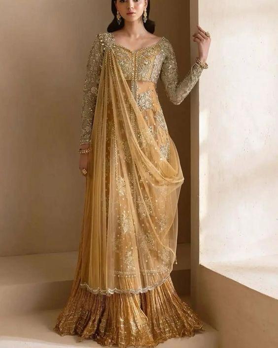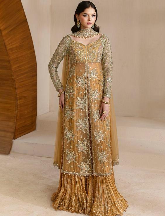 A long, sheer net kameez with full sleeves, embellished heavily with silver and champagne-toned floral embroidery, sequins, and beads. The neckline is unique with a sheer panel, giving a modest yet stylish touch. The embroidery work is dense at the front and sleeves.